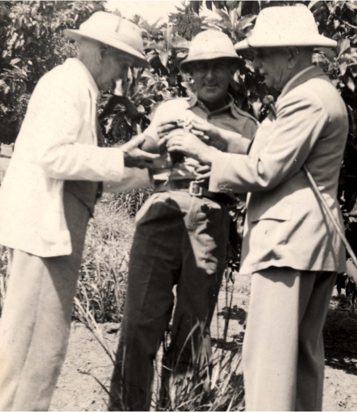 Dr. Merensky with his farm managers on Westfalia Farm examining experimental avocado cultivars.